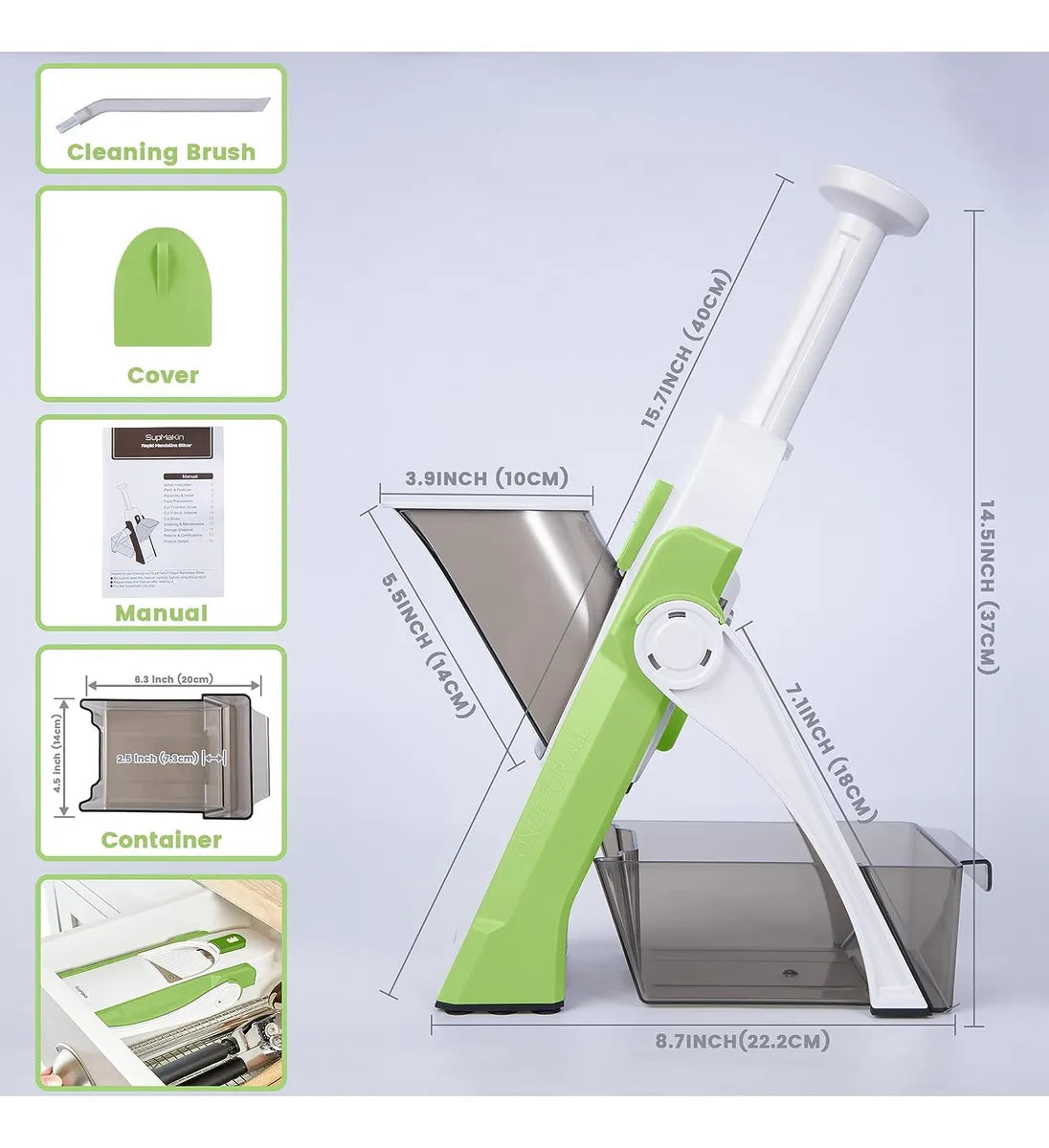 - Cortador más seguro: en comparación con el cortador de verduras tradicional, este cortador vertical es más fácil y seguro de usar, lo que elimina el problema del reemplazo de la cuchilla y los riesgos de seguridad. Multifuncional 4 en 1: este cortador de verduras tiene cuatro modos de corte para elegir: cortar, rallar, cerilla, sin necesidad de cambiar la cuchilla, muy práctico. Hoja de acero inoxidable: la hoja del